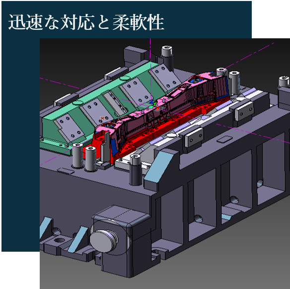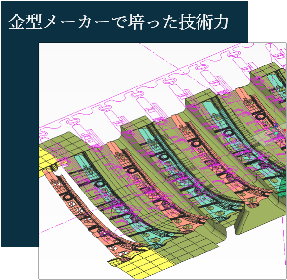 工程設計から型設計、データ作成から成形解析、金型の機械加工から組立て玉成に至るまであらゆる経験を活かし、より合理的で高度な金型造りを型設計・データの両面から実現致します。